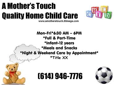 A Mother's Touch is a full service in-home childcare facility licensed by the Ohio Department of Human Service. A Mother's Touch serves children from 2 months through 12 years of age. In addition, I offer a wide range of learning experiences designed to satisfy your child's developmental needs. My program encompasses an educational curriculum of language, math, science, music and art along with an emphasis on small group settings. |